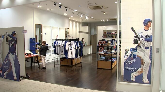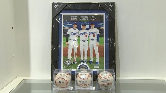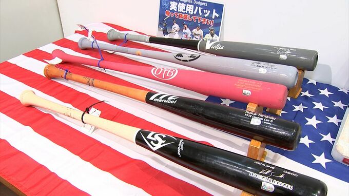 ワールドシリーズ連覇を果たしたドジャースの日本人トリオをはじめ、選手の活躍を商品を通して感じてもらおうと開かれました。このほか、ドジャースの主力選手が使ったバットなど貴重な品の展示も行われています。