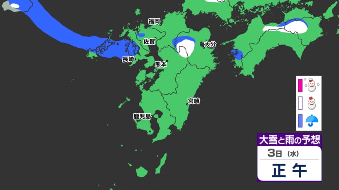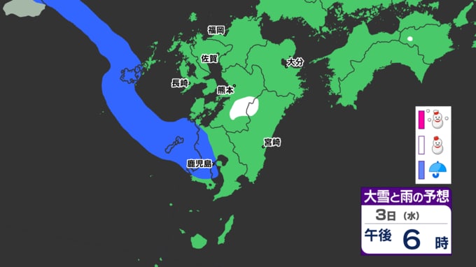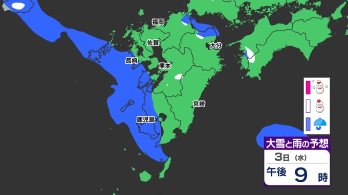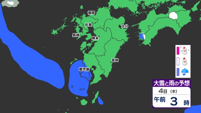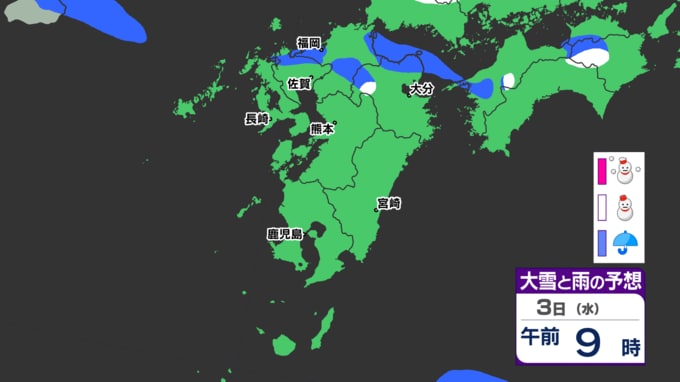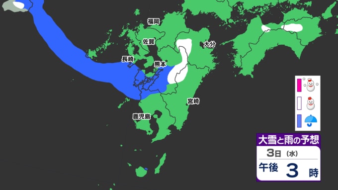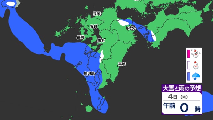 12月3日(木)の「雪と雨のシミュレーション」では、降り出しは「雨」ですが、だんだんと「雪」に変わり福岡県・大分県・熊本県・宮崎県・鹿児島県で、雪を予想する「白」の表示が現れてきます。標高の高い所に車で向かわれる方は、冬用タイヤを準備しましょう。