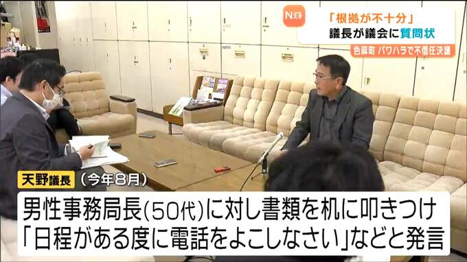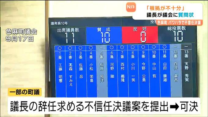 こうした言動がパワハラ行為にあたるとして、一部の議員が9月議会で議長の辞任を求める不信任決議案を提出し可決されています。
