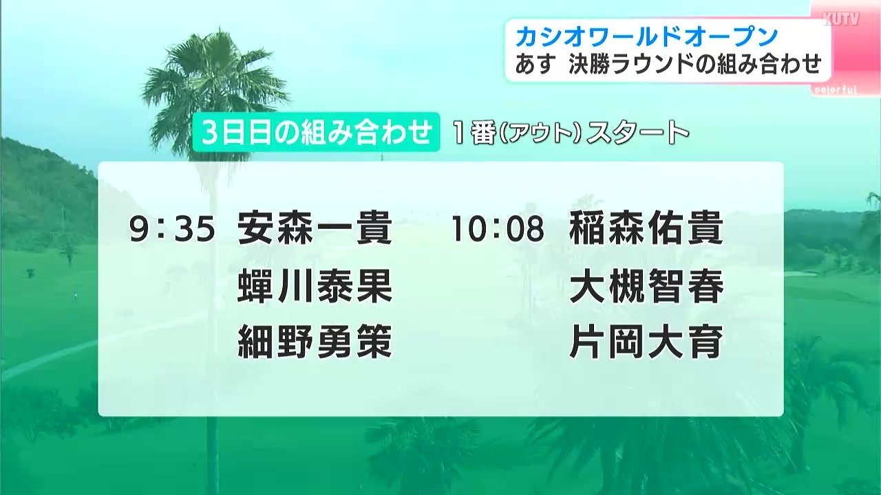 まずは1番・アウトスタートの組から。賞金ランキング3位の蟬川泰果は午前9時35分スタートです。高知市出身の片岡大育は、10時8分スタート。