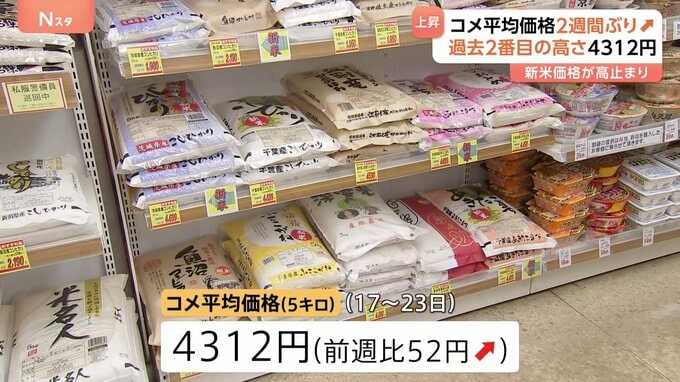 コメの平均価格が5キロ4312円に値上がりし、過去2番目の高さとなりました。農林水産省によりますと、今月23日までの1週間に全国のスーパーおよそ1000店舗で販売されたコメ5キロあたりの平均価格は、前の週より52円…