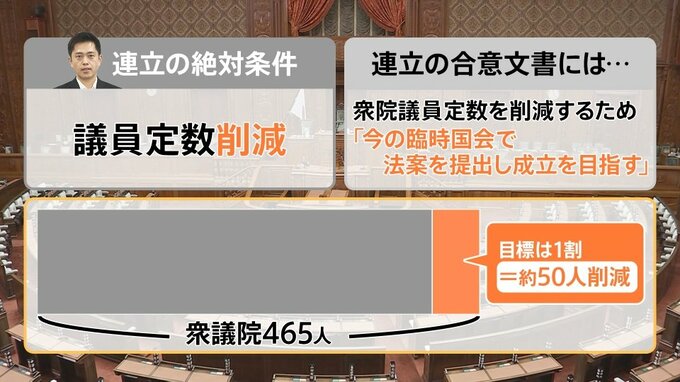 連立の合意文書には「衆院議員定数を削減するため『今の臨時国会で法案を提出し成立を目指す』」と盛り込まれています。
