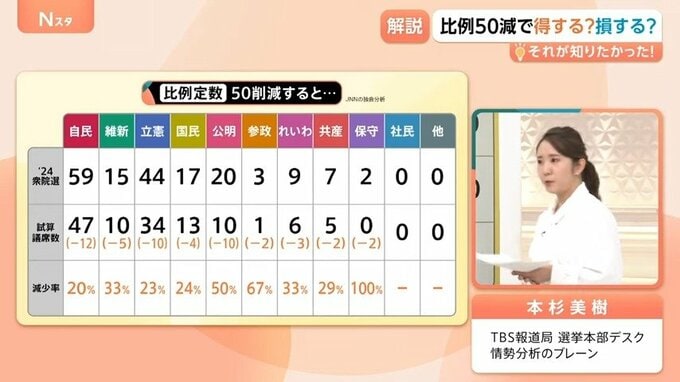 また、少数政党にも大きな影響が出る見込みで、「参政党」は3議席から1議席に、「日本保守党」は2議席から0議席となる試算になっています。