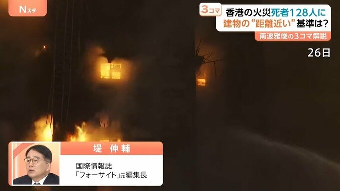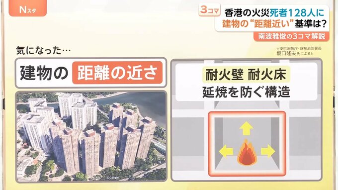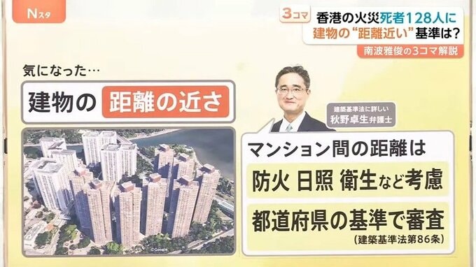 香港のマンション火災では、建物同士の距離の近さもポイントになっています。