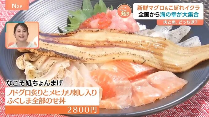 そして別のお客さんが食べているのは、なこそ処ちょんまげの「ノドグロ炙りとメヒカリ刺し入り ふくしま全部のせ丼」(2800円)です。