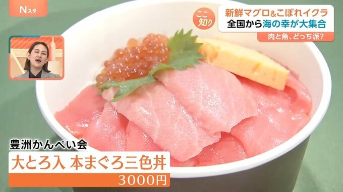 こちらが味わえるのが、豊洲かんぺい会の「大とろ入 本まぐろ三色丼」(3000円)。赤身・中トロ・さらに大トロまで入った、異なる3つの味わいが楽しめるどんぶりです。