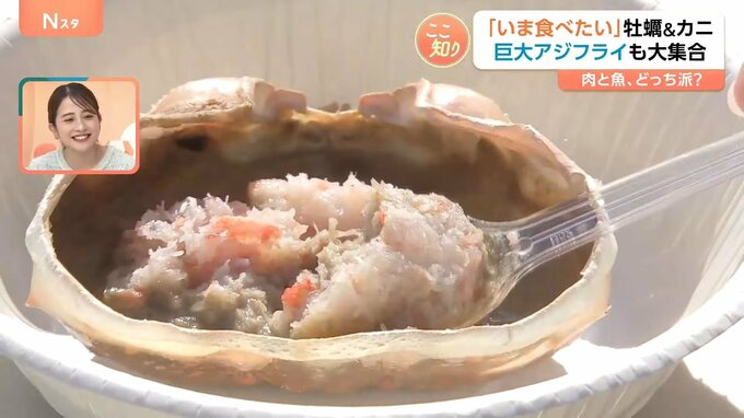 さらに、さっぱりとした味わいが特徴の愛媛・今治産の焼き牡蠣に、顔の大きさほどあるアジフライ。生でも食べられる北海道産のタラバガニの脚も焼いて…