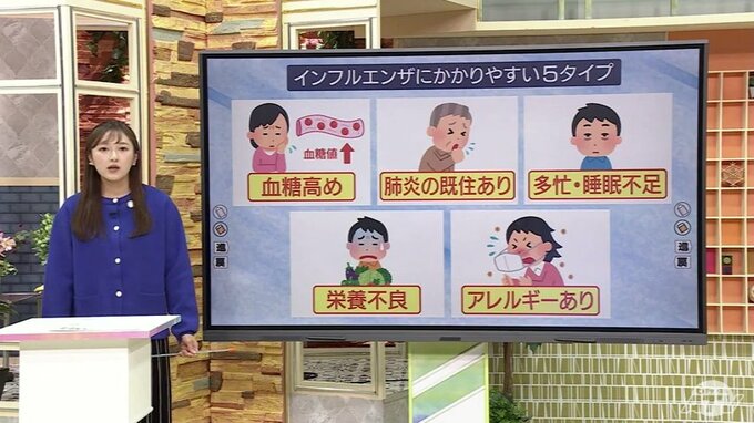 「インフルエンザ」にかかりやすい人の傾向とは? “発症リスクが高まる5タイプ” 複数あてはまると感染リスクがさらに高まる… 要注意な発症リスク約3.6倍の3タイプにあてはまる人は? 青森テレビ 2025年11月29日(土) 07:15 国内 過去最高レベルで流行しているとされる「インフルエンザ」。 この「インフルエンザ」にかかりやすい人の傾向が明らかになりました。 その5タイプが以下になります…。
