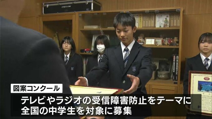 テレビやラジオの電波障害防止を啓発する図案コンクールの表彰式が岡山市北区の中学校で開かれました。