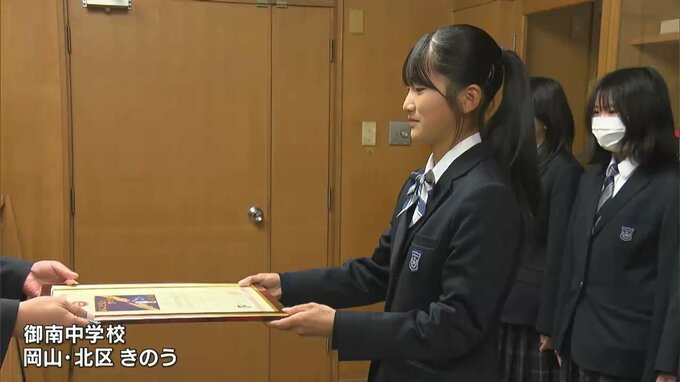 岡山市立御南中学校で開かれた表彰式では、入賞した田附栞奈さんら6人に賞状が贈られました。