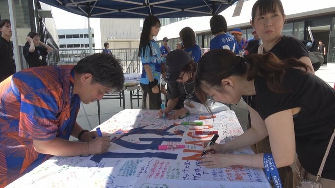 応援メッセージを記入する長崎サポーターからは「名倉選手に戻ってきてほしい、ピースタのピッチに立ってほしいという気持ちで書きました」「長崎に来てくれたころからずっと応援しています。…もうすごくショックで、頑張ってくれると信じています」との声が聞かれた。