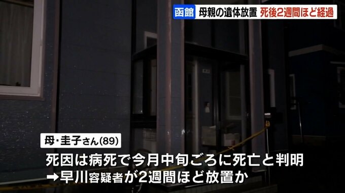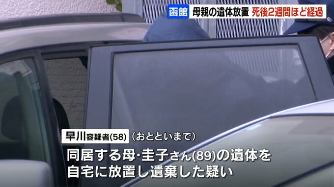早川広容疑者(58)は、函館市桔梗2丁目の自宅に同居する母親の圭子さん(89)の遺体を27日まで放置し、遺棄した疑いで身柄を検察庁に送られました。