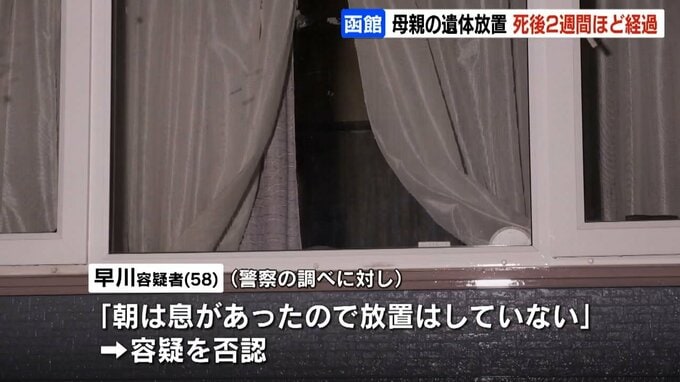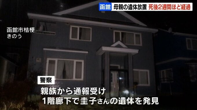 北海道函館市で、89歳の母親の遺体を自宅に放置したとして、58歳の息子が逮捕された事件で、司法解剖の結果、遺体は死後2週間ほど経過していたことが分かりました。
