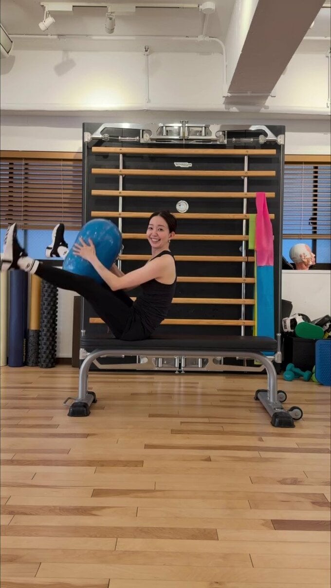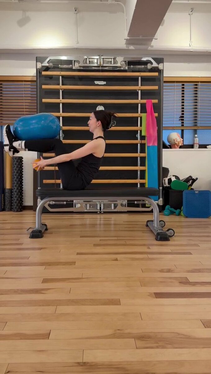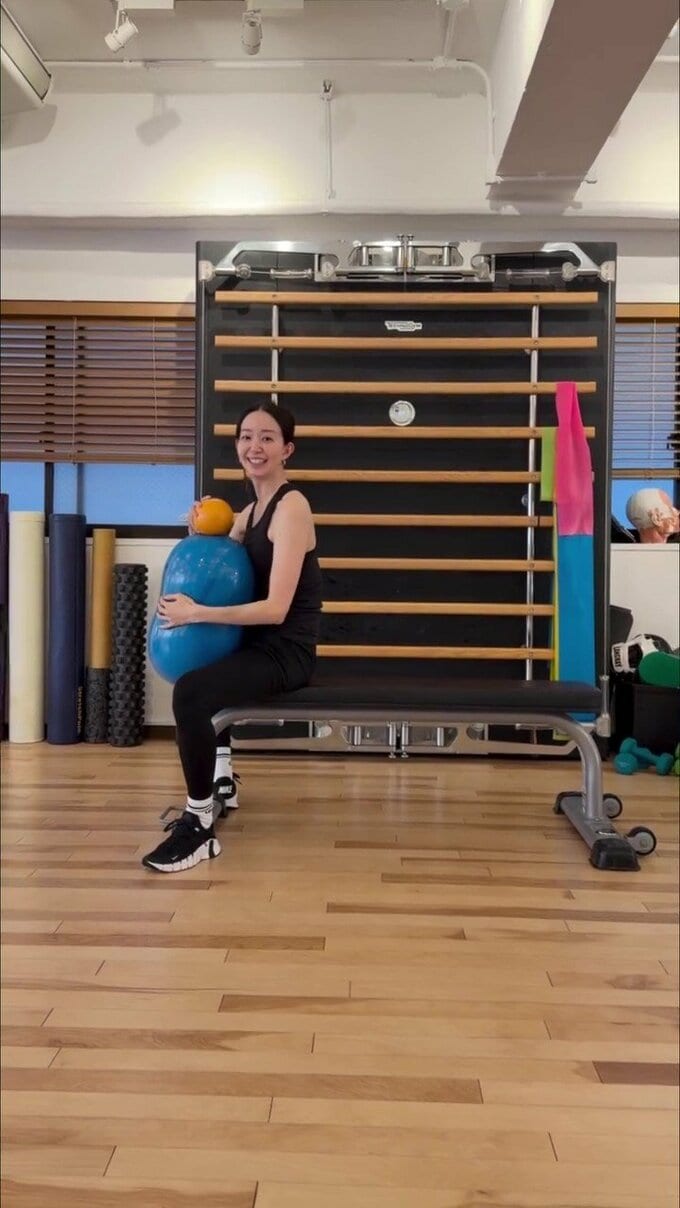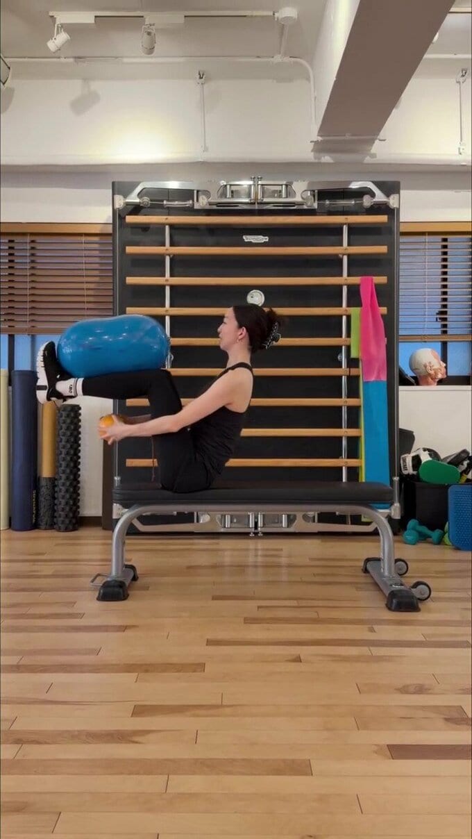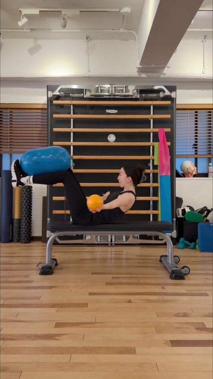 松島さんは「持っているボールは2kgです」とサラリとテキストしていて、それだけでもこのトレーニングの負荷がかなりのものだと想像できますが、驚くべきは松島さんの脚に、ソラマメ型の巨大なバランスボールが乗せられていることです。