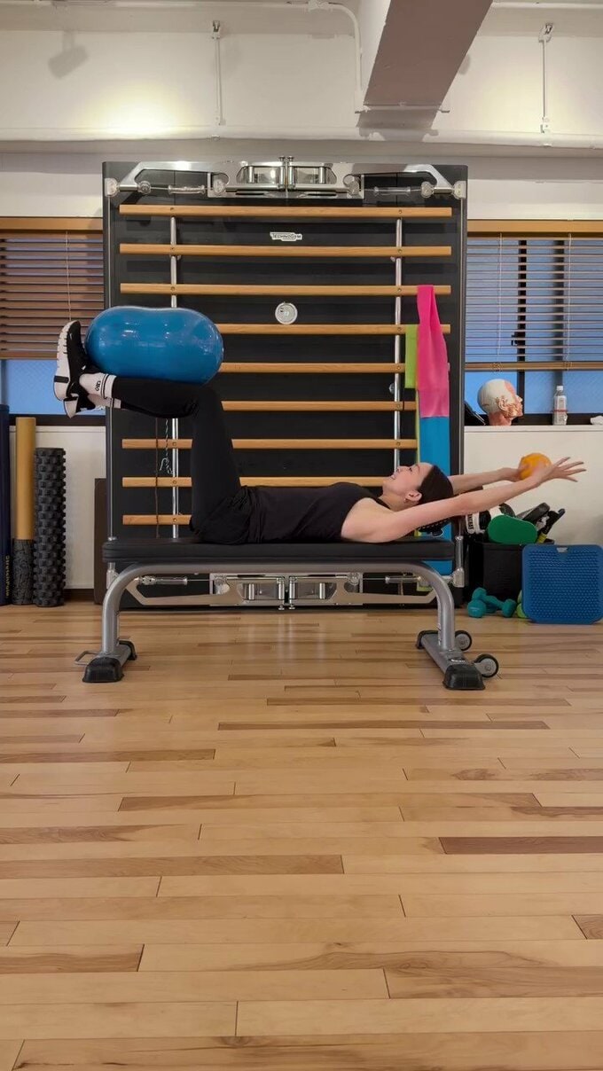 序盤、松島さんはバランスを崩してこのボールを脚から落としてしまいます。しかしめげずに(しかも笑顔で)トレーニングに取り組む松島さん。ボールを持つ腕はたおやかに伸ばし、ちょっと上げづらくなっても腹筋をしっかり動かして上体を完全に上げるなど、一切ごまかしなく全ての動作をやり抜いています。
