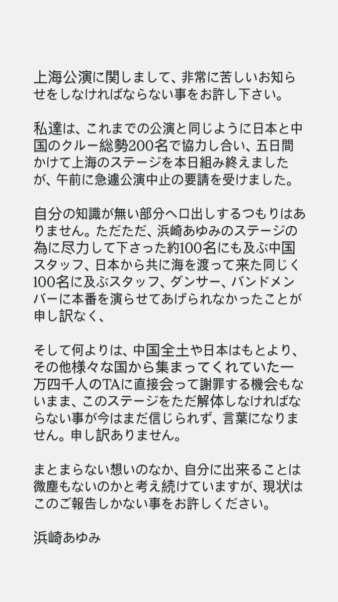 歌手の浜崎あゆみさんが自身のインスタグラムを通じて、アジアツアーの上海公演が中止になったことについての思いを投稿しました。