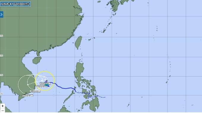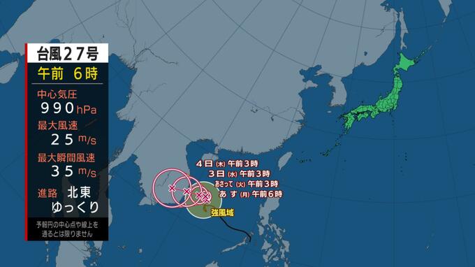 台風27号(コト)は南シナ海をゆっくり北東へ進んでいます。動きが遅く今後はゆっくり西へ進みながら勢力を弱めていく見込みです。