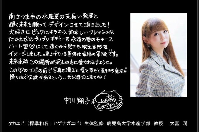 歌手・タレントの中川翔子さんがインスタグラムを更新。鹿児島県南さつま市の野間池みなと広場に、「わたしがデザインした5メートル以上あるタカエビのモニュメントが設置されました!」と報告しました。