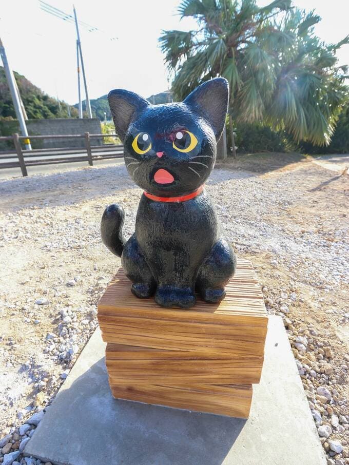 中央には青い球体があり、その前には黒猫の像が設置されています。中川さんによれば、この黒猫は「幸福の象徴」として配置されたものです。