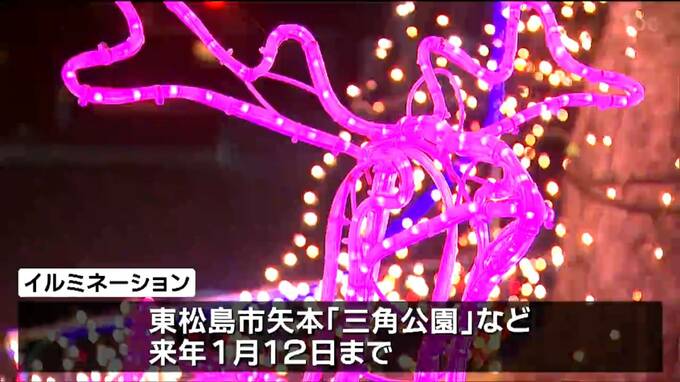 航空自衛隊松島基地に近い通称「三角公園」などで始まったイルミネーションでは、およそ8万個のLED電球が使われています。ブルーインパルスをモチーフにした展示は、青い輝きを放っています。光のトンネルもお目見えし、子どもたちの人気を集めていました。