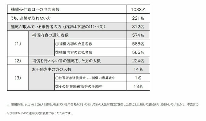 公式サイトでは「被害者救済委員会は被害補償の受付開始後、本日時点までに、合計1033名の方から補償申告をいただいております。そのうち221名の方は、複数回のご連絡を試みてもご返信がない状態です。」と、投稿。