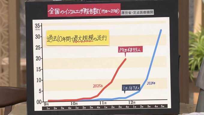 急拡大するインフルエンザは現在、例年よりも1か月早く流行しています。23日までの1週間に定点医療機関からの報告数は19万人超え。2024年の同じ時期の報告数は1万1678人だったので、いかに感染が急増しているかが分かります。このままいけば「過去10年間で最大規模の流行になる」という予測も...