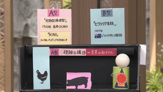 一方のA型は複雑な構造で変異が起きやすく、それに加えて、トリやブタなど様々な動物にも感染し、遺伝子に変異が起きることで、そこからまたヒトへ感染する可能性があるのが特徴です。