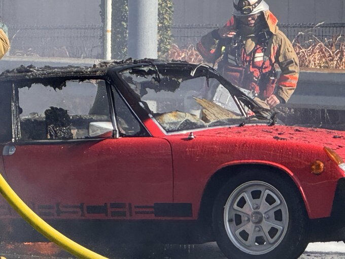 消防車4台が出動し、およそ1時間後に火は消し止められました。車の運転手は自力で脱出し、けがはなかったということです。焼けた車は赤いスポーツカーで、後部付近から火がでたとみられています。