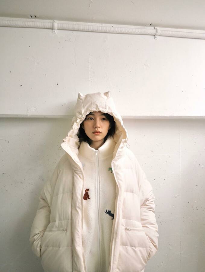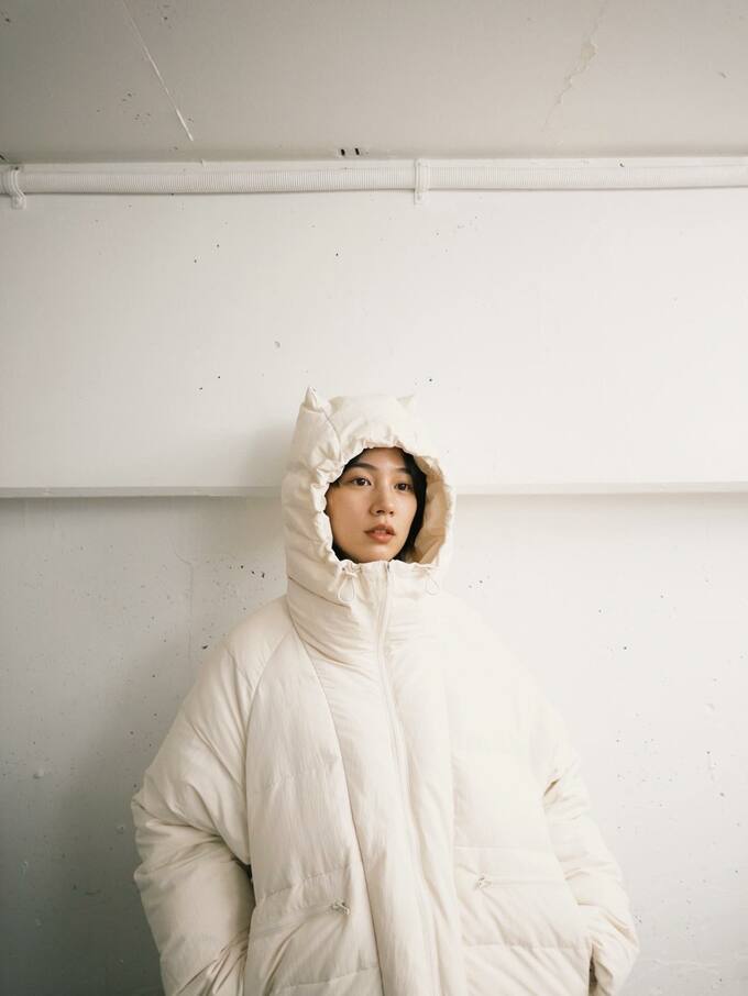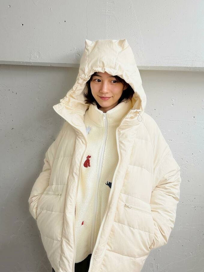 ダウンのフード部分は「猫耳」の様なフォルムをしています。