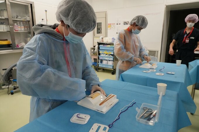 実際に使われている針や医療器具を使い、医師としての基本となる縫合を体験。