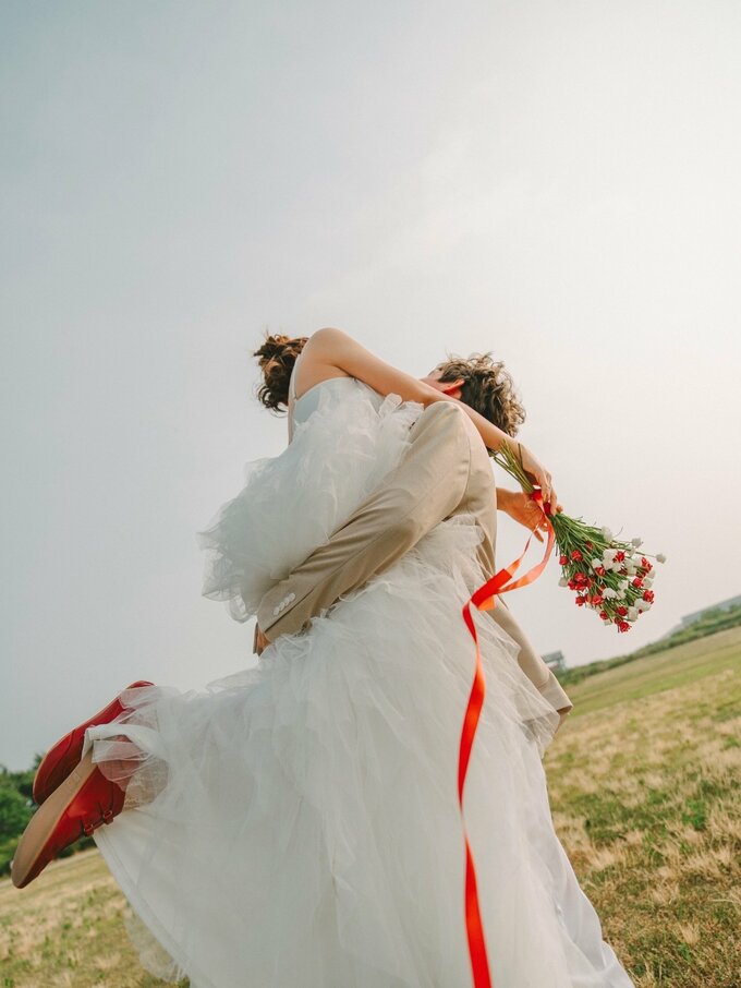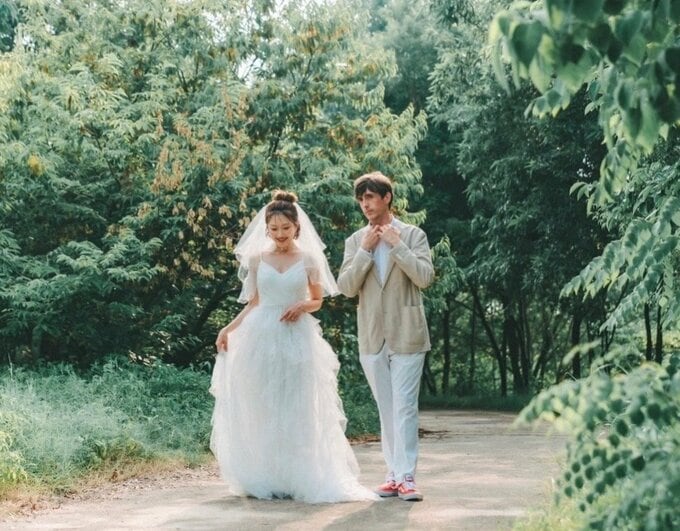 投稿には結婚を報告する文章とともに、幸せな瞬間を捉えた結婚写真が複数枚添えられています。写真では、上枝さんが白いウェディングドレス姿で、ベージュのジャケットを着た新郎と草原や遊歩道で寄り添う様子が収められています。