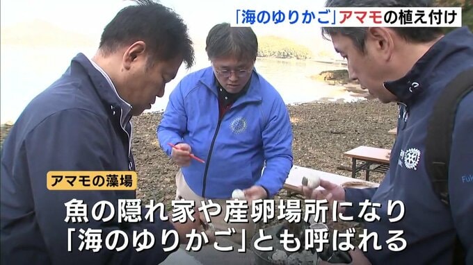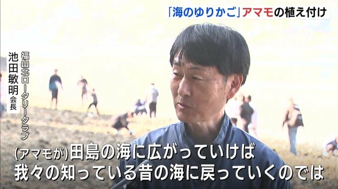 植え付けは福山北ロータリークラブなどが行いました。魚の隠れ家や産卵場所になり、「海のゆりかご」とも呼ばれるアマモの藻場を守ろうと造成に取り組んでいて、去年の植え付けではおよそ120㎡の範囲でアマモが育ちました。