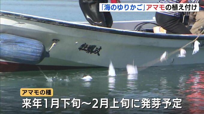 ロープにくくりつけられ海へと沈められたアマモの種は、来年1月下旬から2月上旬に発芽するということです。