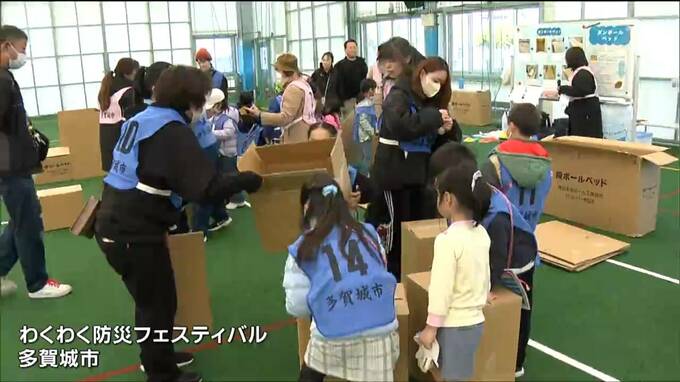 防災について楽しく学んでもらおうというイベントが宮城県多賀城市で開かれ、小学生がダンボールベッドの組み立てなどを体験をしました。