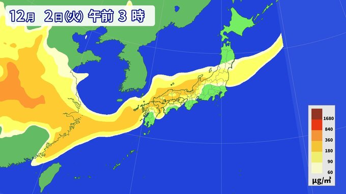 大陸からの「黄砂」も予想されています。きょう午後からあすの日中にかけて、車や建物などへの付着・必要に応じてマスクの着用を心がけてください。濃度が非常に高いわけではありませんが、念のためご注意ください。