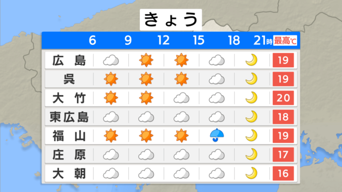 最低気温は、広島市中区9.4℃・庄原市3.1℃・北広島町0.9℃など、晴れて放射冷却が効いたきのう朝と比べ、冷え込みは弱くなりました。