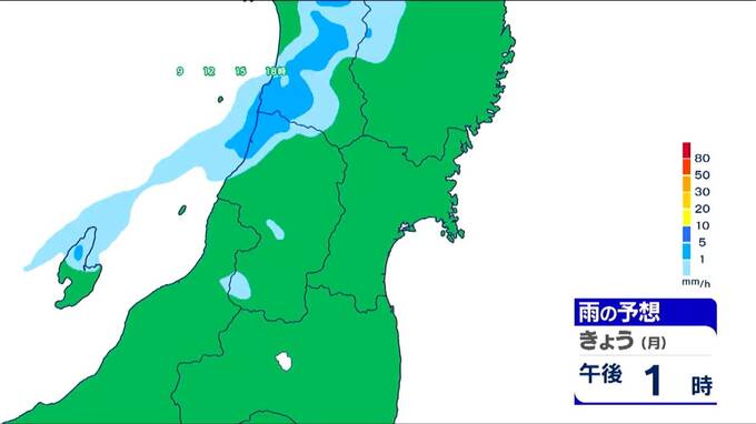 午後1時頃から西の方に寒冷前線の雨雲が接近し、時間の経過とともに前線が県内を通過していきます。このため、西部の山沿いを中心に所々で雨が降るでしょう。大気の状態が不安定となるため、局地的には雷雨となる可能性もわずかにあります。