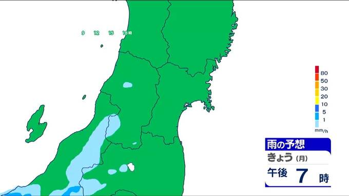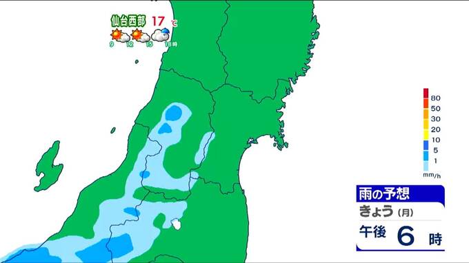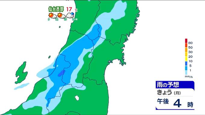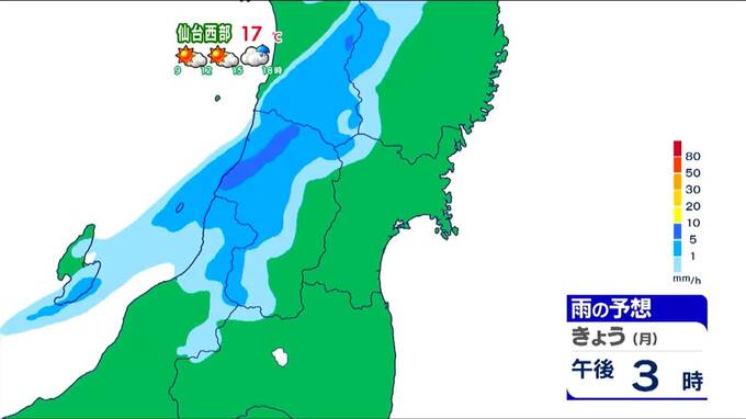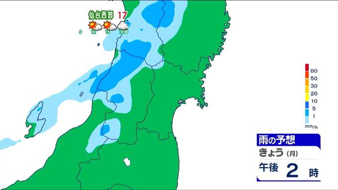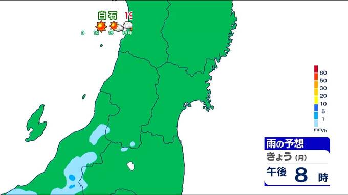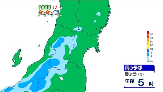 日中はたっぷりと日差しが届きますが、山沿いの方は午後から雲が広がり、川崎町周辺を中心に一時雨が降るでしょう。最高気温は名取で19℃、川崎・蔵王で18℃、七ヶ宿で17℃の予想です。