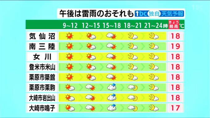 朝晩を中心に晴れますが、夕方は北部山沿いで最もにわか雨の可能性が高くなります。午後は雷雨となるおそれもありますので、天気の急変にお気をつけください。気仙沼の最高気温は18℃、南三陸は19℃、鳴子は17℃の予想です。