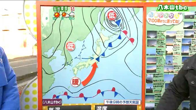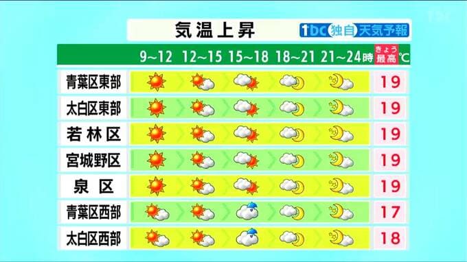 仙台の気温推移を見ると、7℃だった気温は正午に17℃、午後3時には最高気温19℃まで上がる予想です。その後は前線通過に伴い気温が下がり始め、午後9時には11℃、深夜には9℃まで低下します。