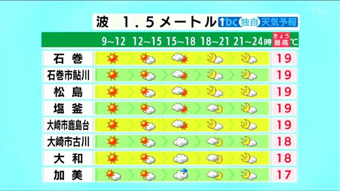 朝と夜を中心に晴れますが、山沿いの加美では一時雨が降る見込みです。波の高さは1.5メートルと、明日にかけてやや高い状態が続くでしょう。