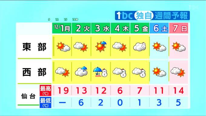 前線通過後は寒気の影響で気温が大きく下がります。12月2日朝の最低気温は仙台で6℃と、1日朝とほぼ変わらない冷え込みとなる見込みです。日中の暖かさとは対照的に、夜間から翌朝にかけては冷え込みますので、暖かくしてお休みになることをお勧めします。