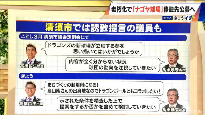 高橋哲生市議が今年3月の市議会定例会で「ドラゴンズの新球場が立地する夢を思い描いてはいかがでしょうか」と質問しました。永田純夫市長は「内容が全くわからない状況。球団の動向を注視していきたい」と述べるに留まりました。