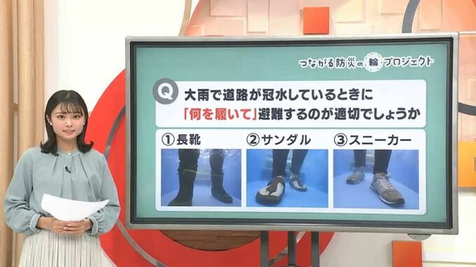 問題はこちら。大雨で道路が冠水している時に何を履いて避難するのが正しいでしょうか。(1)長靴(2)サンダル(3)スニーカー
