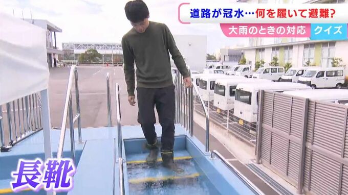 実際どれくらい違いを感じるのか。冠水した道路を体験できる機械で水深を30センチに設定して甲野アナウンサーが検証してみました、まずは長靴から。