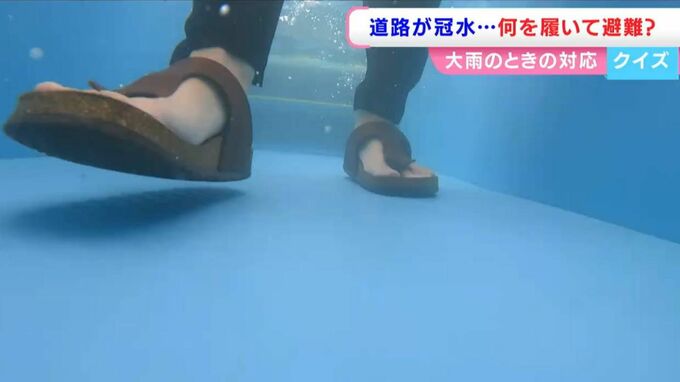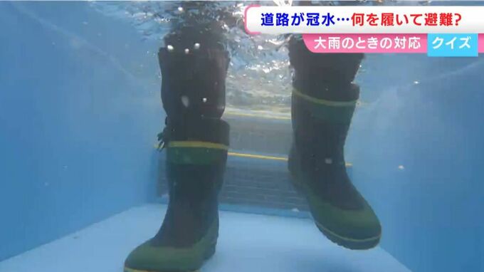 「長靴だと中に水が入ってきて、重くなってしまう。そして、地面がぬかるんでいると動きづらくなってしまいます。」「サンダルだとすぐ脱げてしまう、瓦礫などでけがをする可能性があります」