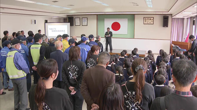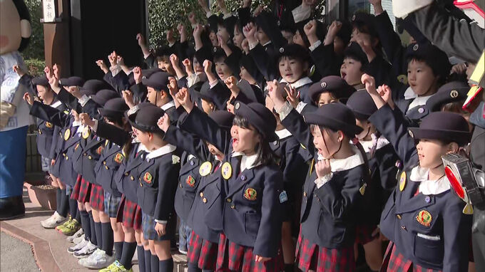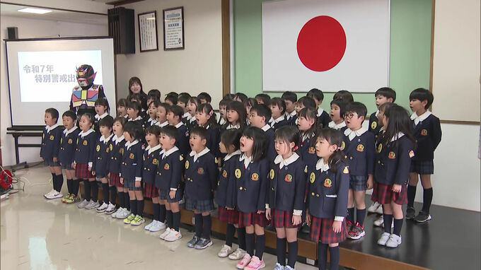 北九州市戸畑区で年末年始特別警戒の出発式が行われ、園児たちが「一日警察署長」として元気に安全を呼びかけました。
