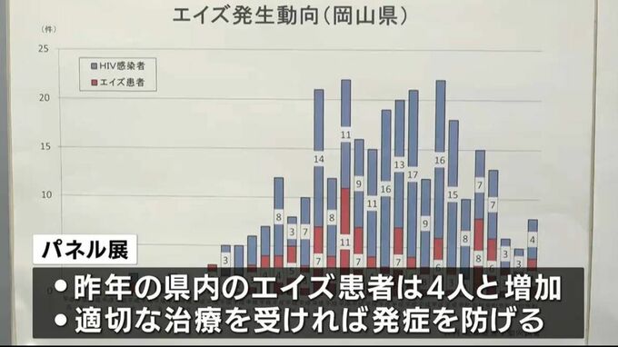 HIVウイルスに感染することで免疫力が低下し、様々な感染症を発症した状態を指すエイズ。パネル展では、昨年の岡山県内の患者が4人と一昨年に比べて2人増えていることや適切な治療を受ければ発症を防げることなどを紹介しています。