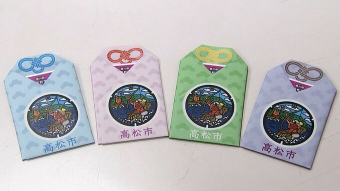 4色のお守り袋に入っていて、屋島の戦いで船上の的を射ぬいた那須与一をデザインした、高松市のマンホールのふたが描かれています。穴に「落ちない」表面がデコボコで「滑らない」ふたにあやかって合格をと、朝から市民が受け取りに訪れていました。