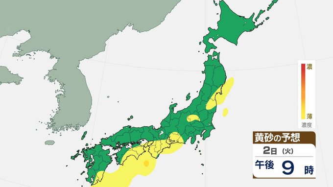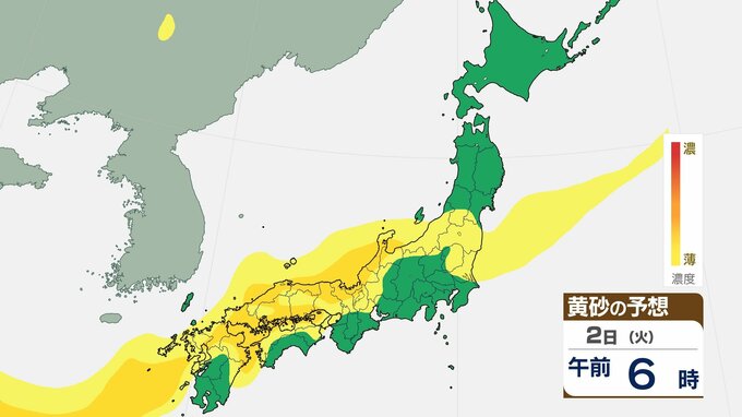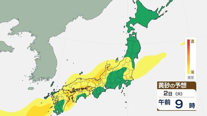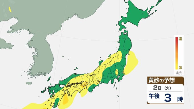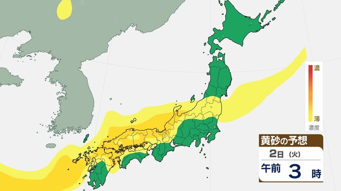 【黄砂情報】1日夕方から2日にかけて西日本の広範囲に黄砂予想 視程低下や交通影響のおそれ【1日~3日までの黄砂シミュレーション】